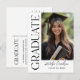 Elegant graduation announcement postcards feature a vertical photo of the graduate with modern decorative black serif Graduate text and text that can be personalized with the graduate's name and class year. The back of the postcard includes simple announcement wording that can be personalized and mailed by the proud parents of the graduate. Simply include a guest address and postcard stamp to mail - no need for an envelope.