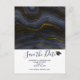 A graduation party save the date postcard. Designed with a black graduation cap illustration and a beautiful image of dark abstract agate stone. Colors swirl in waves. Main colors are black, blue-gray with a faux-gold ribbon running through the design. Modern and trendy.
