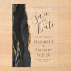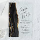 The left-hand edge of this elegant modern wedding save the date card features a black watercolor agate border trimmed with faux gold glitter. The customizable text combines charcoal gray handwriting, copperplate and italic fonts on a clear background.