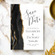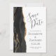 The left-hand edge of this elegant modern wedding save the date card features a black watercolor agate border trimmed with faux gold glitter. The customizable text combines charcoal gray handwriting, copperplate and italic fonts on a white background. The reverse side is solid off-black.