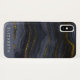 Phone case with a beautiful image of dark abstract agate stone. Colors swirl in waves. Main colors are black, blue-gray with a faux-gold ribbon running through the design. Modern and trendy.