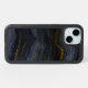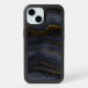 Phone case with a beautiful image of dark abstract agate stone. Colors swirl in waves. Main colors are black, blue-gray with a faux-gold ribbon running through the design. Modern and trendy.
