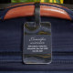 A personalized luggage tag with a beautiful image of dark abstract agate stone. Colors swirl in waves. Main colors are black, blue-gray with a faux-gold ribbon running through the design. Modern and trendy.