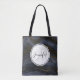 Personalized tote bag with a beautiful image of dark abstract agate stone. Colors swirl in waves. Main colors are black, blue-gray with a faux-gold ribbon running through the design. Modern and trendy.