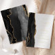 The left-hand edge of this elegant modern wedding invitation features a black watercolor agate border trimmed with faux gold glitter. The customizable text combines handwriting, copperplate and italic fonts in real gold foil on a white background. The reverse side features a matching black and gold agate design.