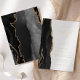 The left-hand edge of this elegant modern wedding invitation features a black watercolor agate border trimmed with faux gold glitter. The customizable text combines handwriting, copperplate and italic fonts in real gold foil on a white background. The reverse side features a matching black and gold agate design.