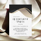 An elegant retirement party invitation with a unique abstract waves pattern in modern black, gold, and tan over a white background. The combination is strikingly attractive and makes a professional impression. Personalize the easy-to-use text template with your event details. These invitations are available as both printed and paperless digital download for your convenience.