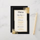 An elegant yet modern design featuring faux gold foil luminous succulents in opposite corners of this wedding menu. A black background .