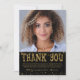 Modern black and gold graduation Thank You card featuring gold glitter typography and confetti, one photo and your pre-printed thank-you note on the front and a keepsake photo with your graduate's name, school or university name and class year on the back. ASSISTANCE: For help with design modification or personalization, color change or transferring the design to another product, contact the designer BEFORE ORDERING via the Zazzle Chat MESSAGE tab or email makeitaboutyoustore@gmail.com.
