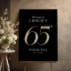 Modern minimalist 65th birthday party welcome sign features stylish faux gold foil number 65 and your party details in classic serif font on black background, simple and elegant.