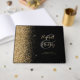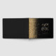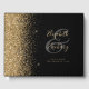 This elegant wedding guest book features a left-hand border of faux gold glitter on a black background. Easily customize the gold-colored text with the names of the bride and groom in whimsical handwriting calligraphy over a large gray ampersand. Add additional text of your choice to the front and spine.