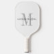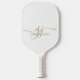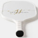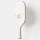 A simple modern monogrammed pickle ball paddle for your game. Gold black script initial on white.