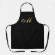 An elegant monogrammed apron with gold script with unique bold flourish, and white serif name on a rich black background. Modern trendy style.
