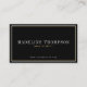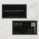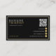 This business card features a sleek black background with elegant double-line gold white borders. The front showcases a centered name in bold white serif font, with a gold title below and a minimal website link at the bottom. The back continues the refined theme with the name left-aligned—first name in white, last name in gold—followed by a smaller title. A QR code sits in the top right corner, while gold icons paired with white text neatly present contact details on the right. A gold social media handle appears at the bottom left, completing the professional and stylish design.