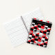 This spiral notebook features a colorful geometric pattern with red, black, white, and gray polygons. Personalize it with your name in simple white font placed at the top.