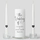 Modern black and white wedding unity candle set highlighting "The Wedding Of" in bold heart script lettering. The couple's names and date are displayed in clean typography, with heart accents on each taper candle. A striking and timeless ceremony keepsake with all text fully editable.