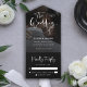 These modern, elegant black and white all in one wedding invitations feature your own personal photo covering the top background completely. A sheer black overlay contains white trendy script typography, and the rest of the background is black. A glam, stylish look your guests will love!