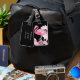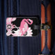 The product design features a flamingo with kaleidoscopic paisley patterns in shades of pink. This tropical bird illustration makes a modern and unique luggage tag.