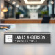 A sleek, professional desk nameplate featuring a classic black background with crisp white typography and space to add your custom business logo. The modern sans serif name pairs with an elegant serif job title for a polished, branded look perfect for corporate offices, reception desks, trade shows, and staff workspaces. The logo, name, and job title fields are fully customizable.