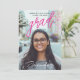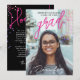 This modern stylish Photo Announcement for graduation features minimalist design adorned with bold magenta and white typography, complemented by a striking large photo, on the front. Flip it over to the back, where all the graduation details are elegantly presented against a stylish black background. Feel free to personalize the photo and texts to make it uniquely yours. Plus, it's conveniently available in digital download format for easy sharing. Make a statement with this chic announcement!!