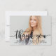Stylish and elegant flat format graduation thank you card features a senior photo with trendy "thank you" black script overlay. Personalize the modern custom text with your grad's name, school, and class year. A custom thank you message and / or photo can be added to the back of the card.