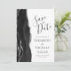 The left-hand edge of this elegant modern wedding save the date card features a black watercolor agate border trimmed with faux silver glitter. The customizable text combines charcoal gray handwriting, copperplate and italic fonts on a white background. On the reverse side, easily replace the sample image with a photo of the future bride and groom, and add one to three lines of additional information such as your wedding website URL.