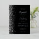 The left-hand edge of this elegant modern wedding invitation features a silver faux glitter design. The customizable text combines real silver foil handwriting, copperplate and italic fonts on a black background. The reverse side features a matching black and silver glitter design.
