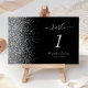 The left-hand edge of this elegant modern wedding table number features a silver faux glitter design. The customizable text combines silver gray handwriting, copperplate and italic fonts on a black background.