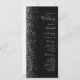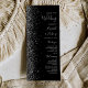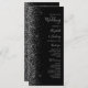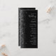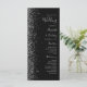The left-hand edge of this elegant modern wedding program features a silver faux glitter design. The customizable text combines silver gray handwriting, copperplate and italic fonts on a black background.