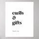 This modern black typography cards and gifts sign is perfect for a simple wedding or bridal shower. The black and white minimalist design features a retro yet contemporary font with a unique rustic bohemian feel. Perfect for any season. Keep it minimal, as is, or add your own graphics and artwork. The line of text at the bottom of the sign can be personalized with the date, the names of the bride and groom, or a short message like "Thank you". This sign can be used for a wedding or any event or party.