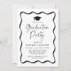 Celebrate your graduate with this stylish graduation party invitation, featuring a graduation cap at the top and "Graduation Party" elegantly displayed in modern black script on a white background. The graduate's name and party details are highlighted within a black wavy frame, adding a unique retro touch to the design. The back showcases the graduate’s senior photo with space for their name, school, and graduation year, creating a personalized keepsake. Perfect for high school or college graduates, this modern yet vintage-inspired invitation sets the tone for a memorable celebration.