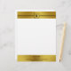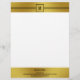 At the top, there's a display initial you can edit to show the right monogram. The black letter is inside a faux gold square that has a black border. Black lines are on both sides of the square. At the bottom, there are four lines of black display text for your custom text such as a name, professional title, address, phone number, website, or email address. The faux gold elements are not made of foil.