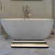 Chic bath mat done in a contemporary bold striped pattern, in black, white and gold tone. Matching bathroom products are available. Comes in three sizes.