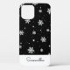 This modern iPhone 12 case features a trendy Christmas pattern with white stars and snowflakes on a black background. Personalize it with a name in the matching black font.