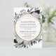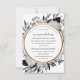 Black and white watercolor florals of hydrangeas, eucalyptus and peonies with faux gold circular border (optional). All text is customizable, as well as the backer pattern.