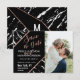 Elegant, chic, and modern black and white painted marble with faux printed rose gold stripe detail and rose gold glitter sequin typography script on a black background, Save-the-Date wedding card. This classic and sophisticated design is perfect for the trendy and stylish marrying couple. Personalize with your own message on the front as well as a customized monogram initial on the back. All photo print design.