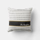 A modern black and white striped throw pillow with a hint of gold. Personalize it with your name. Fits the minimalist Japandi decorating style. Designed for you by Blackberry Boulevard.