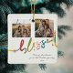 This Christmas tree photo ornament features the colorful word "blessed" and three photo templates for inserting family photos. It's modern, and family-friendly, with beautiful little artistic details.