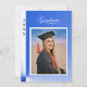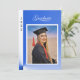 A unique and modern card with a modern blue, abstract color scheme. Similar blue background on the back of the card containing graduation details. The photo and all text is easily changed with the template. The "Graduate" text, however, is actually a graphic image but is editable. While the message suggests a high school graduate, the text can certainly be modified for any educational institution. Selecting “Personalize this design” offers you several edit options to easily change the text (wording, plus type font, color, size, position) and to possibly edit the design elements. You may also want to scroll down to the section “Transfer design to a product” for a few suggestions about other items this design can be used on.