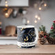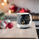 Capture the magic of the holiday season with our elegant, modern Christmas coffee mug. Gold and blue leaves accents dance across a serene dark navy backdrop, creating a sense of charm. Add your favorite Christmas greeting to personalize this coffee cup keepsake.