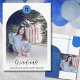 Celebrate the graduate with this modern script graduation invitation featuring an arch shaped photo frame on the front, a second photo on the back room to brag about the grad, too. Class of 20___ also on the front. All blue accent colors easily changed to match your photo or the school colors.