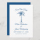 Ask your guests to save your wedding date with this simply elegant design featuring modern script, blue text and an artistic palm tree. Customize it with your wedding date, names and location.