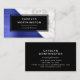Modern, trendy design features simple white lettering in a black rectangle, against a dramatic background of white marble and sapphire blue faux brushed metal foil. Add your contact information on the reverse in white sans serif font on a solid black background.