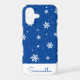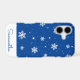 This cute Christmas iPhone case features a trendy winter pattern with white stars and snowflakes on a blue background. Personalize it with a name in the matching handwriting font.