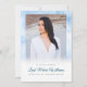 This stunning modern memorial thank you card features a large photo on the front with a blue, cream and white cloudy background. The bottom is an angelic like white fade and text. The back features a 6 photo collage. The bottom has a heartfelt thank you message.