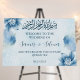 Customize and personalize your wedding sign poster, starts off with Bismillah welcome to the wedding of (Insert your names) and we created you in pairs light blue watercolor floral roses with dark blue typography. Muslim Islamic wedding sign by Happily ever after.