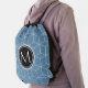Modern Blue Geometric and Monogrammed Pattern Drawstring Bag