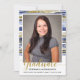 This trendy graduation announcement features your favorite photo on a background of navy blue, light blue, and gold glitter brush strokes. Gold text "Graduate" in script and your name, school and graduating year complete the design. Back features navy blue, light blue, and gold glitter brush strokes.