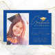 Send your family and friends a unique personalized photo college graduation card to wow them. This template design features your custom photo on the left and to the right a white grad cap sitting on the word "Graduate" written in a hand lettered faux gold script typography. Personalize your class/year, name, degree and other ceremony details on a classic royal blue background. Designed by Susan Coffey.