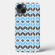 This iPhone 13 case features a colorful geometric herringbone pattern in blue, dark gray, and white.
